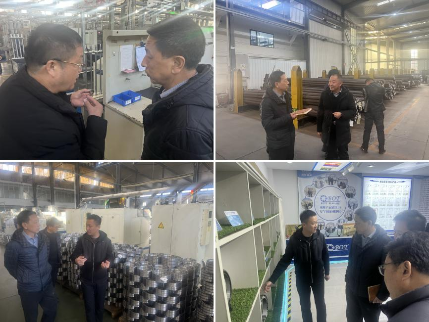 在臨清市,郭潤(rùn)宇一行走訪了藍(lán)宇精密軸承、博特軸承、同興鍛造及凱美瑞等軸承明星企業(yè),深入車(chē)間了解企業(yè)生產(chǎn)經(jīng)營(yíng)情況。在博特軸承,企業(yè)相關(guān)負(fù)責(zé)人帶領(lǐng)參觀了軸承生產(chǎn)車(chē)間及裝配車(chē)間,詳細(xì)介紹其主營(yíng)產(chǎn)品薄壁軸承的生產(chǎn)加工過(guò)程及技術(shù)難點(diǎn)。調(diào)研完畢后,郭潤(rùn)宇與企業(yè)負(fù)責(zé)人深入溝通交流,針對(duì)生產(chǎn)裝配車(chē)間現(xiàn)階段存在的問(wèn)題,郭潤(rùn)宇提出了數(shù)字化智能車(chē)間的升級(jí)方案,著力幫助企業(yè)解決制約車(chē)間管理效率等方面的多項(xiàng)難題,為企業(yè)發(fā)展排憂(yōu)解難。